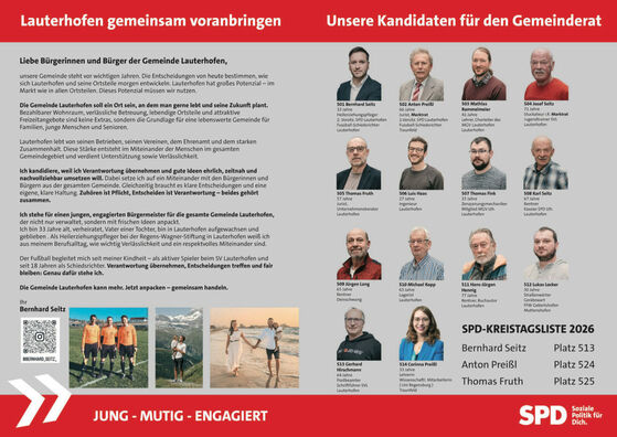 Am Sonntag, den 22. Februar 2026 lud die SPD Lauterhofen anlässlich der Kommunalwahlen am 08. März 2026 zum politischen Frühschoppen ins Sportheim Lauterhofen ein. Der SPD-Ortsvorsitzende und Marktrat Anton Preißl begrüßte dazu ca. 60 Besucherinnen und Besucher. Dabei präsentierte der SPD-Bürgermeisterkandidat Bernhard Seitz das Wahlprogramm der SPD-Gemeinderatsliste. Zudem stellte sich der SPD-Landratskandidat Dirk Lippmann und seine politischen Ziele vor. Auch erfolgte eine Vorstellung der Kandidierenden der SPD-Gemeinderatsliste.